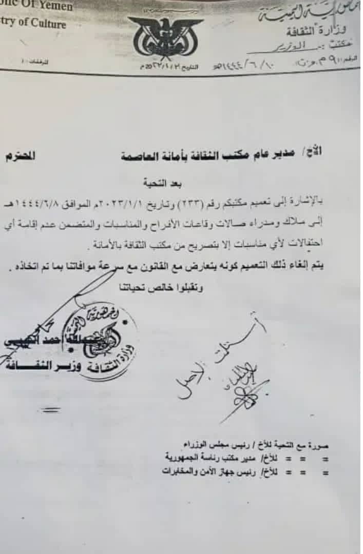 وحسب الوثيقة التي جاءت بتعميم وزير الثقافة في صنعاء عبدالله الكبسي ومواجهة الى مكتب الثقافة بأمانة العاصمة بإلغاء القرار وسرعة موافاة الوزارة بما تم اتخاذه.