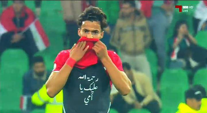 وظهر اللاعب حمزة الريمي بعد نهاية المباراة وخلع قميصه ليشاهده الملايين مكتوب في فنيلة أخرى رحمة الله عليك يا امي.
